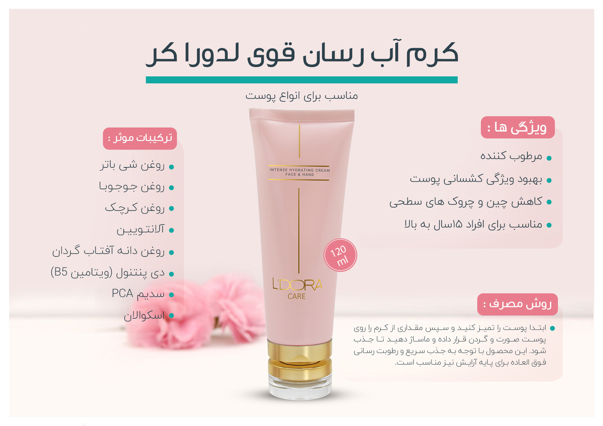 کرم آب رسان، این محصول حرفهای یک مرطوبکننده مناسب برای انواع پوست است مواد موثر منحصر بهفرد موجود در کرم آبرسان قوی لدورا علاوه بر آبرسانی به بهبود ویژگی کشسانی (الاستیسیته) پوست نیز کمک میکند. این کرم فوقالعاده سبک و ملایم است و باعث کاهش چروکهای سطحی پوست میشود.